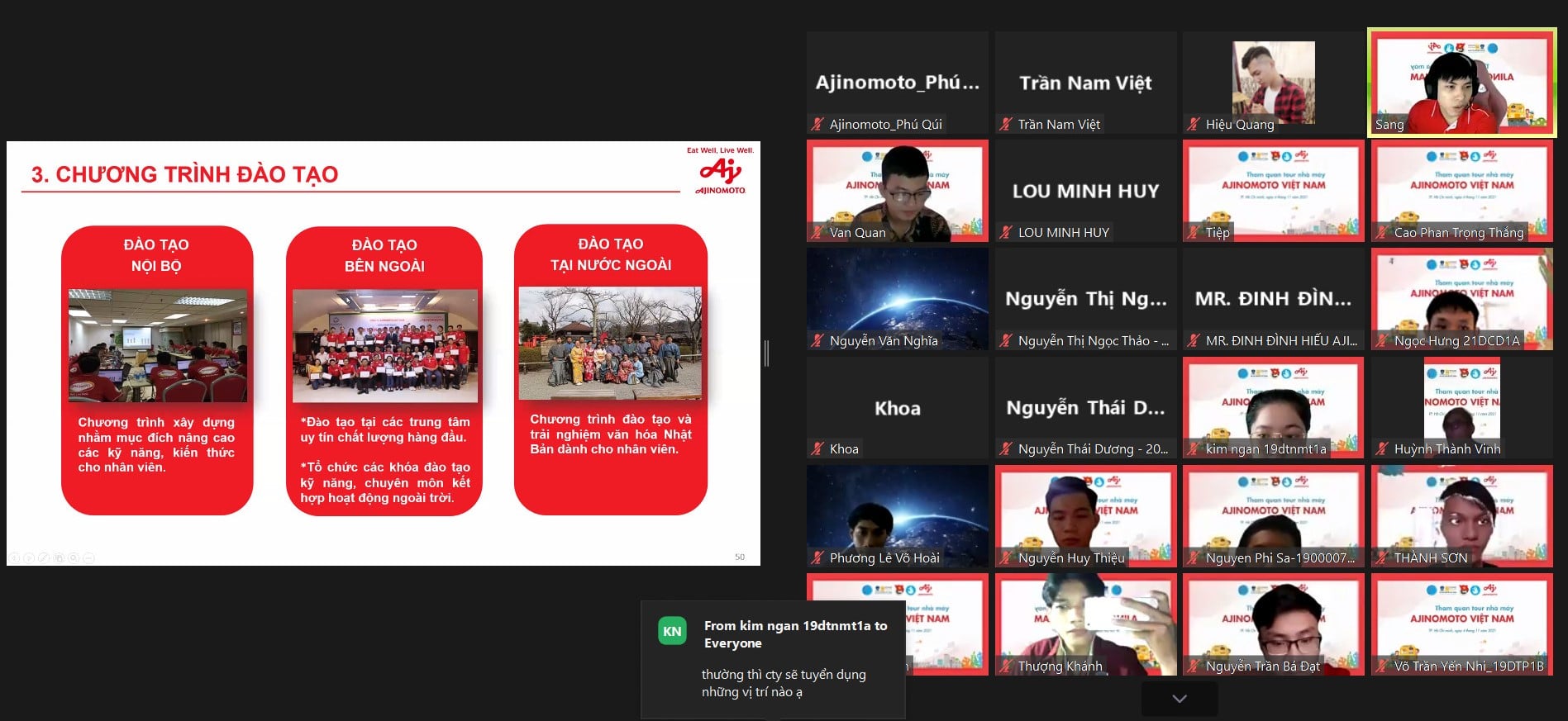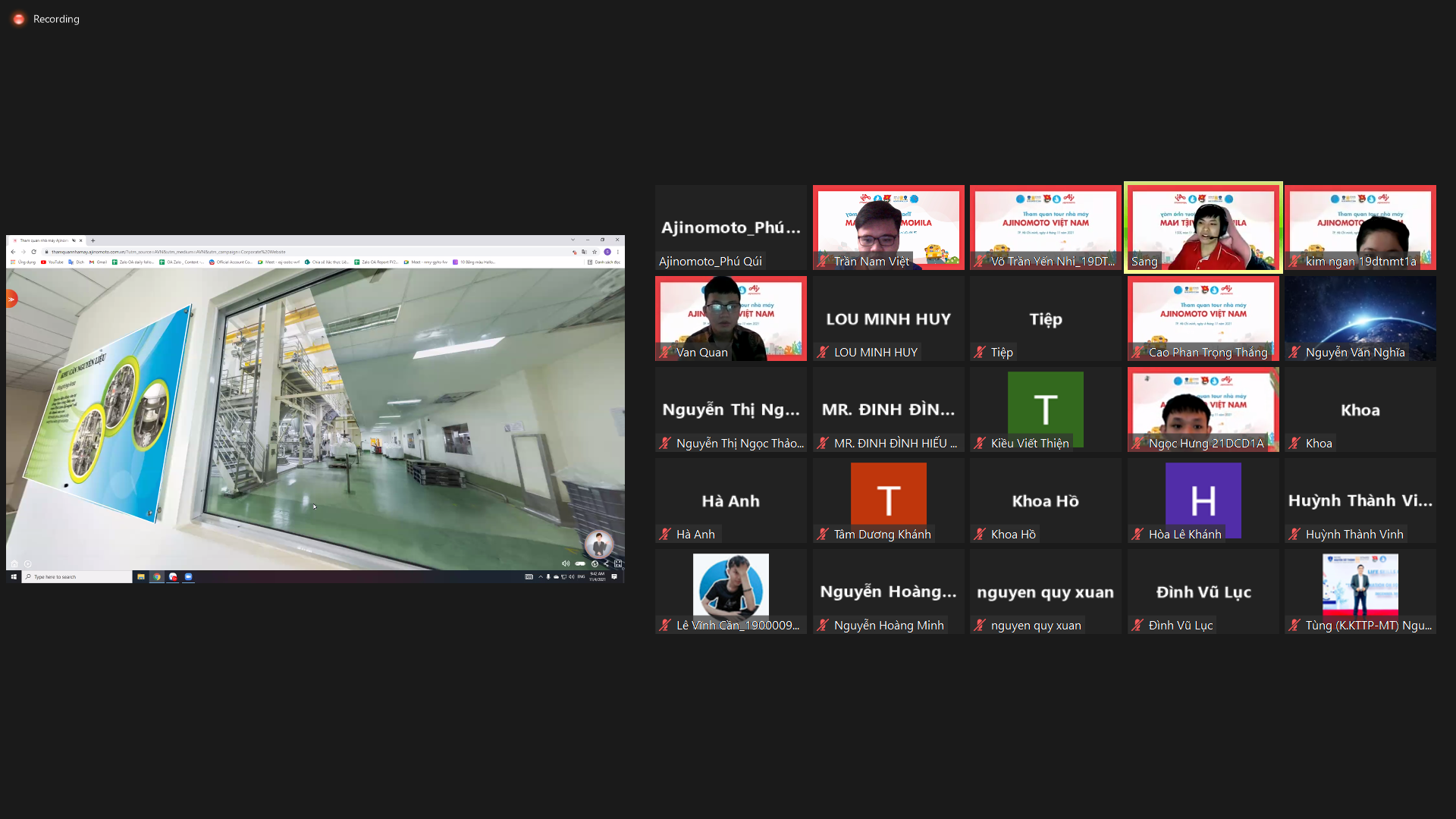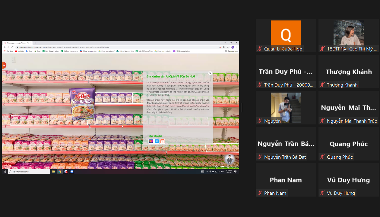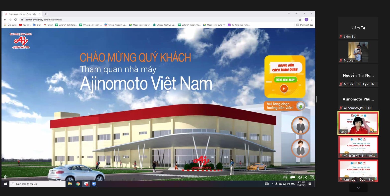Sáng nay (4/11/2021), sinh viên NTTU đã có dịp được tham quan trải nghiệm online cùng Công ty Ajinomoto Việt Nam. Chương trình được sự phối hợp giữa Nhà văn hóa sinh viên, Công ty Ajinomoto và Đoàn – Hội SV Trường Đại hoc Nguyễn Tất Thành với mong muốn giúp sinh viên có thể nắm bắt thêm về các công nghệ, quy trình sản xuất các vấn đề thực tế trong môi trường làm việc liên quan đến chuyên môn nghề nghiệp.