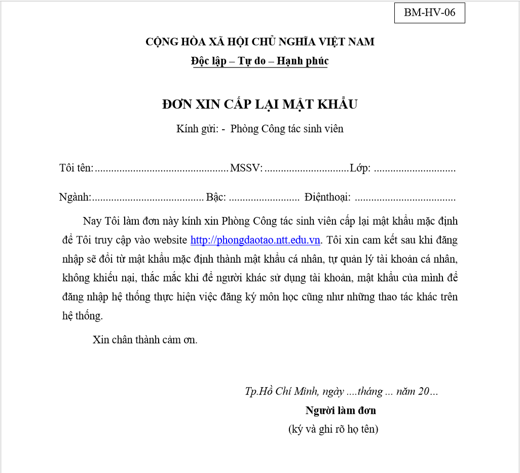Trang chủ / Góc sinh viên / Đơn xin cấp lại mật khẩu Đơn xin cấp lại mật khẩu ntlam / 1:39 pm 21/09/2021 Bấm vào để tải biểu mẫu Danh mục Góc cảnh giác Mẹo vặt/Kỹ năng sống Nhắc nhở hằng ngày Tin liên quan BIểu mẫu công tác sinh viên 12/09/2022 Phiếu tự khai thông tin sinh viên 26/07/2022 PHIẾU ĐỀ NGHỊ CHỈNH SỬA THÔNG TIN CÁ NHÂN – Áp dụng cho các trường hợp không có minh chứng đính kèm 05/04/2022 Đơn đề nghị cấp mới thẻ Ban cán sự lớp 21/09/2021 Mẫu đơn xin nghỉ học BH-HV-07 21/09/2021