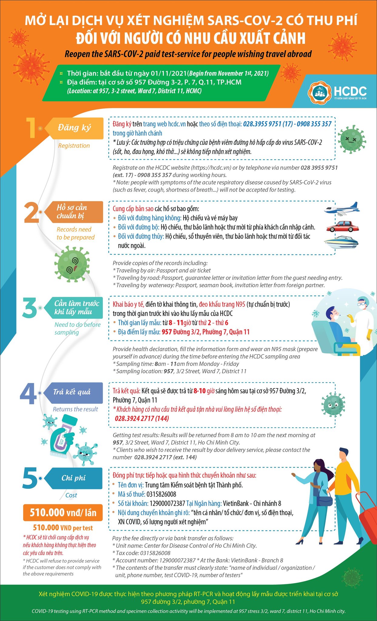 Infographic: Cập nhật thông tin dịch vụ xét nghiệm SARS-CoV-2 có thu phí đối với người có nhu cầu xuất cảnh tại HCDC.