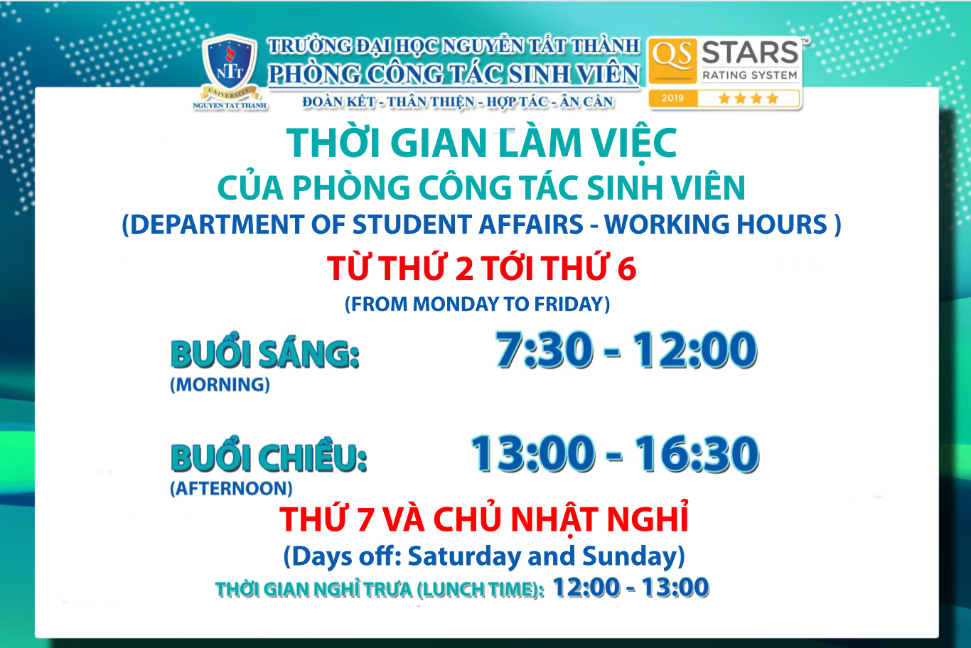 Trang chủ / Góc sinh viên / Quy định về Khung giờ làm của phòng Công tác Sinh viên Quy định về Khung giờ làm của phòng Công tác Sinh viên ntlam / 11:04 am 21/09/2021 Danh mục Góc cảnh giác Mẹo vặt/Kỹ năng sống Nhắc nhở hằng ngày Tin liên quan Quy chế Công tác sinh viên đối với chương trình đào tạo đại học hệ chính quy của Trường Đại học Nguyễn Tất Thành 26/04/2022 Quyết định: Ban hành Quy định tổ chức hoạt động hội Cựu sinh viên trường Đại học Nguyễn Tất Thành Trường Đại học Nguyễn Tất Thành Ban hành Quy định tổ chức hoạt động hội Cựu sinh viên trường Đại học Nguyễn Tất Thành 12/04/2022 Quyết định: Ban hành Quy định về công tác Y tế học đường Trường Đại học Nguyễn Tất Thành Ban hành Quy định về công tác Y tế học đường 12/04/2022 Quyết định: Ban hành Quy định về hoạt động phục vụ cộng đồng của Trường Đại học Nguyễn Tất Thành Trường Đại học Nguyễn Tất Thành Ban hành Quy định về hoạt động phục vụ cộng đồng của Trường Đại học Nguyễn Tất Thành 12/04/2022 Quyết định: Ban hành Quy chế ngoại trú của sinh viên Trường Đại học Nguyễn Tất Thành Trường Đại học Nguyễn Tất Thành Ban hành Quy chế ngoại trú của sinh viên Trường Đại học Nguyễn Tất Thành 12/04/2022