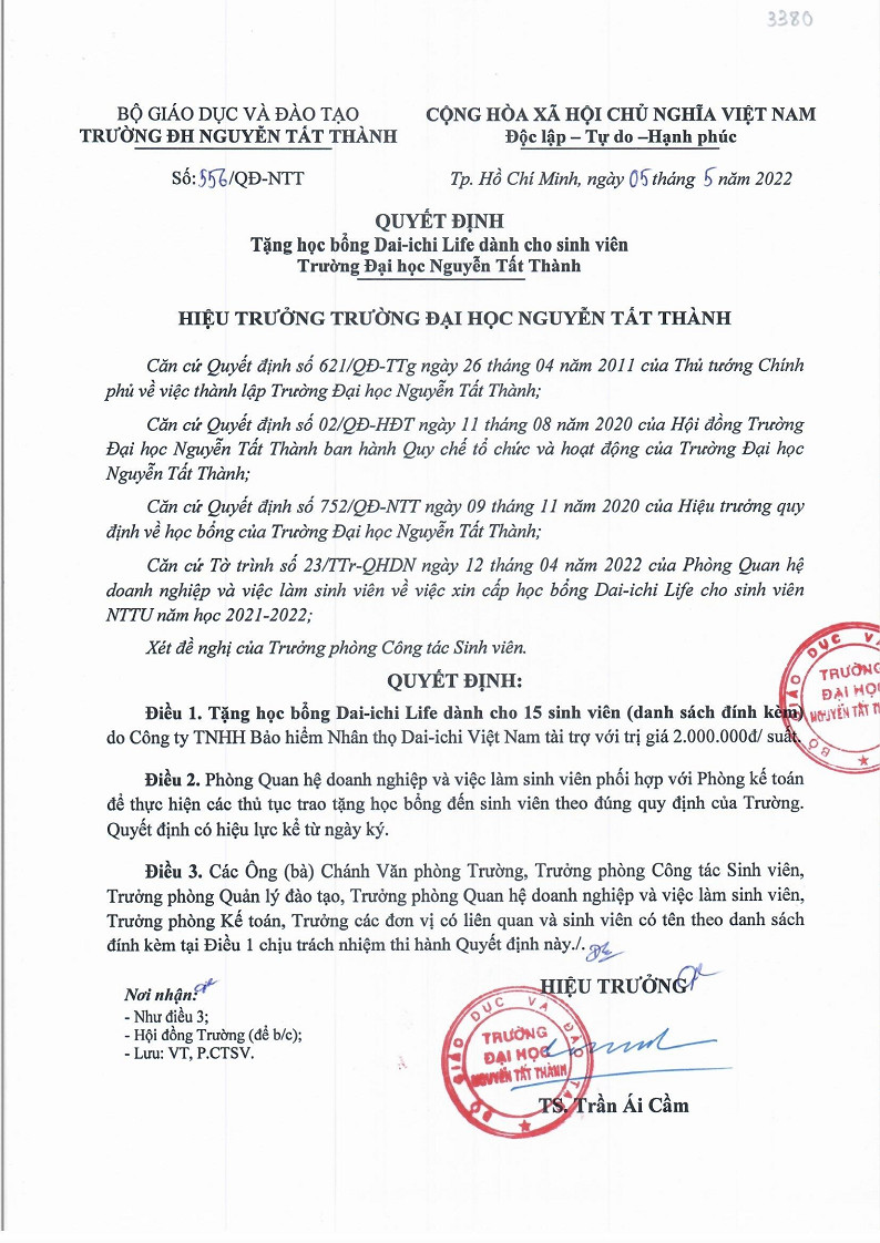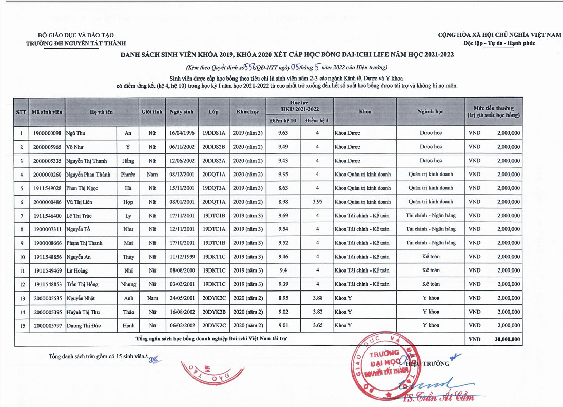 TP. Hồ Chí Minh, ngày 05/05/2022 Công ty BHNT Dai-ichi Việt Nam (Dai-ichi Life Việt Nam) đã phối hợp cùng Đại học Nguyễn Tất Thành (NTTU) tiến hành trao 15 suất học bổng cho sinh viên năm 2-3 các ngành Kinh tế, Dược và Y khoa có điểm tổng kết (hệ 4, hệ 10) trong học kỳ I năm 2021-2022 từ cao nhất trở xuống đến hết số suất học bổng được tài trợ và không bị nợ môn. Chương trình được Dai-ichi Life Việt Nam thực hiện vào ngày 05/05/2022 về việc trao học bổng này với tổng số tiền trao tặng là 30.000.000đ.