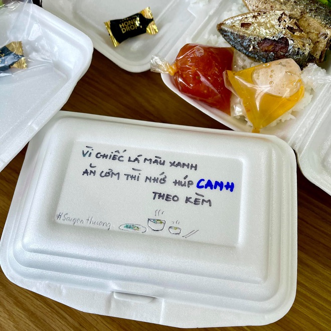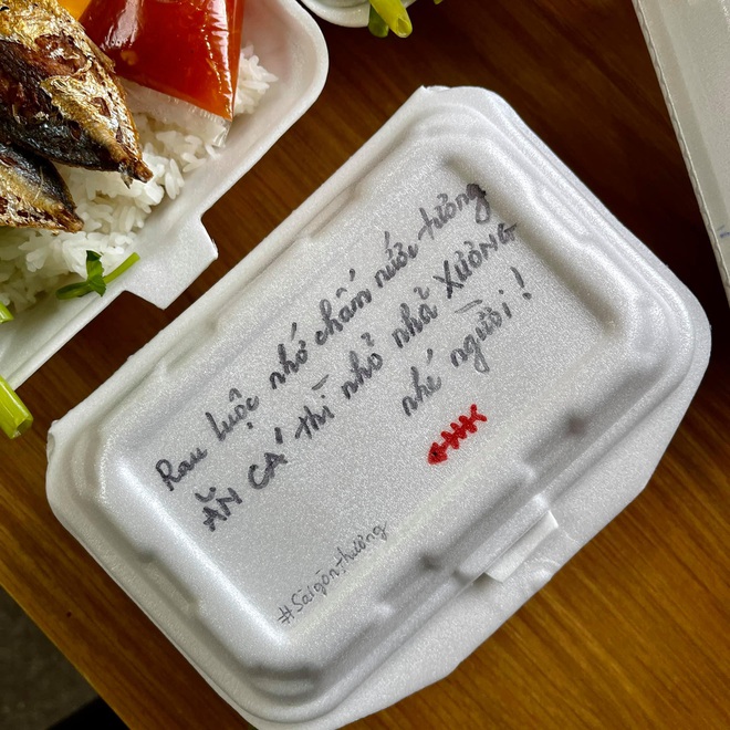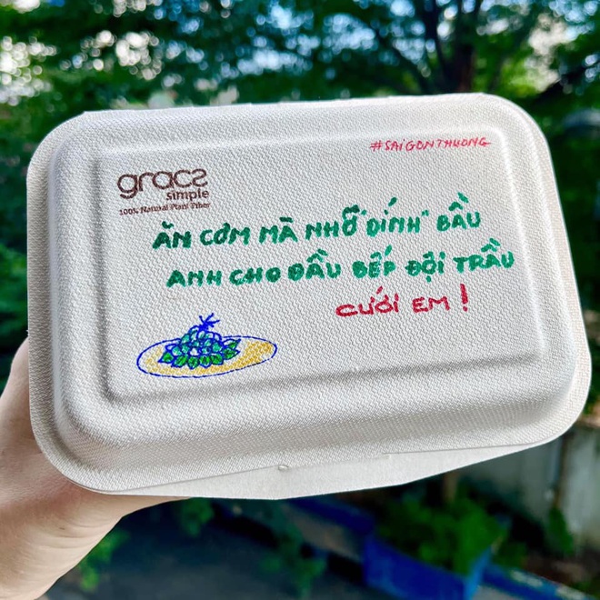 “Hôm nay canh trứng nấu cà/Ăn xong một bát chết bà cô-vi”; “Cảm ơn đội ngũ lương y/Kéo bao sinh mạng từ cô-vi về”; “Cơm ngon hơn nhiều người yêu cũ”… là dòng chữ trên những hộp cơm “Saigonthuong”.