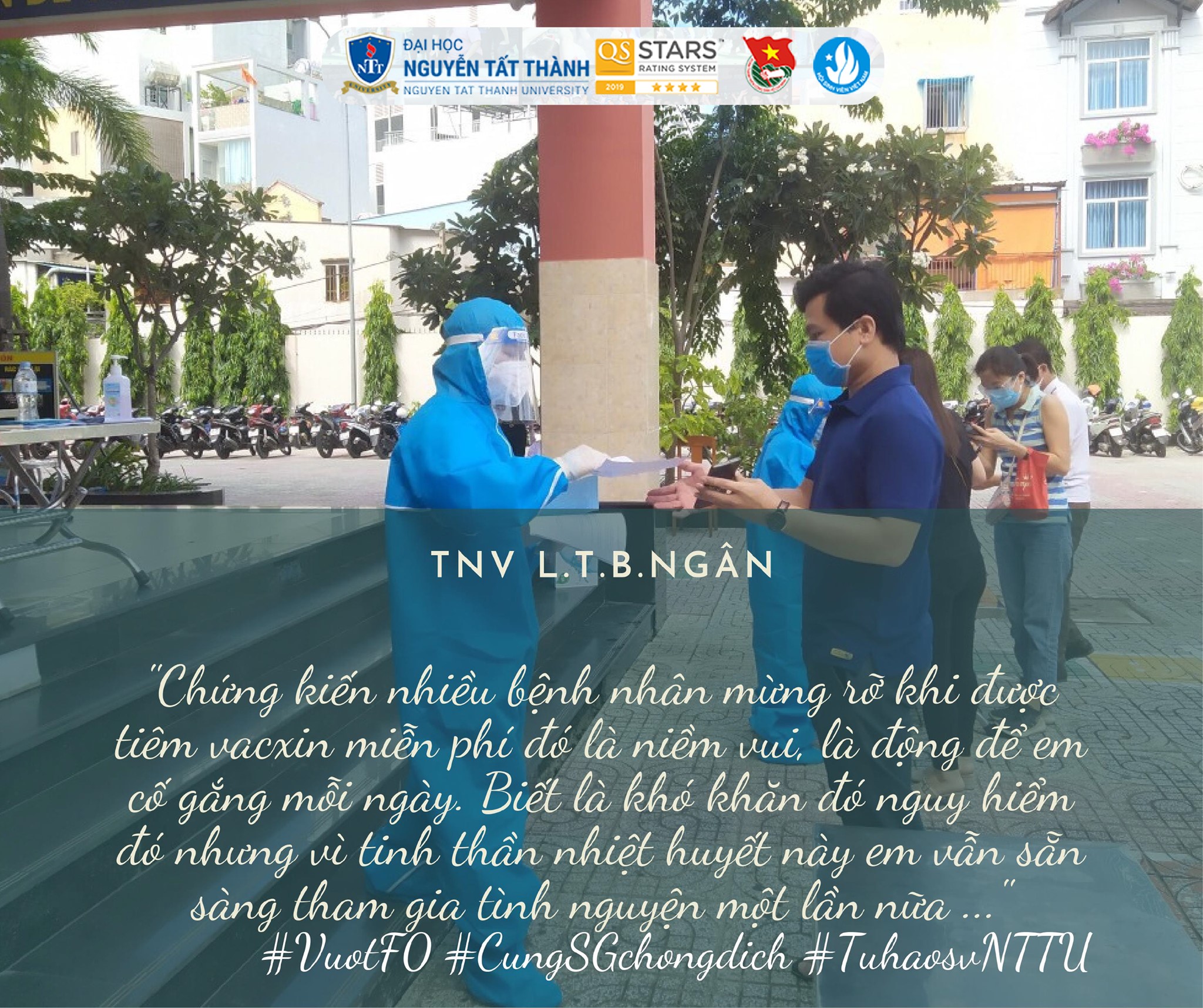 Em L.T.B. N cũng là một TNV không may nhiễm bênh, tưởng chừng em sẽ chẳng dám quay trở lại nhiệm vụ nguy hiểm này. Nhưng thật phi thường, chính sự thôi thúc của trách nhiệm em đã nhanh chóng vượt qua và tiếp tục cống hiến. Xúc động nhớ về những ngày tháng khó khăn vừa qua, em kể: “Chứng kiến nhiều bệnh nhân mừng rỡ khi được tiêm vacxin miễn phí đó là niềm vui, là động để em cố gắng mỗi ngày. Chắc có lẽ chính sự hạnh phúc khi nhận được lời cảm ơn của các cô, các bác được giúp đỡ đã làm em thêm yêu và hãnh diện về công việc mình đang làm. Khi phát hiện mình bị F0 thì cảm xúc em rất lo sợ và bối rối, sợ đồng đội mình bị lây, sợ không thể tiếp tục nhiệm vụ được. Những cũng chính nhờ các anh chị bên trường quan tâm động viên, hướng dẫn mà em cũng an lòng hơn. Vì khu cách ly em ở rất xa nhà nên cũng khá khó khăn và thiếu thốn, các chị đều hỗ trợ em rất nhiệt tình từ những viên thuốc đến từng hộp bánh hộp sữa,… Hằng ngày, đều gọi cho em hỏi thăm về tình hình sức khỏe, động viên tinh thần, nhắc nhở em ăn uống và anh chị còn dặn “Cần gì thì chứ báo” anh chị sẽ chuẩn bị gửi vô ngay. Em cảm thấy anh chị ấy như gia đình của em vậy, đến nay khi em được xuất viện các anh chị vẫn luôn gọi điện hỏi thăm sức khỏe em. Những ngày trong khu cách ly, nhìn các bệnh nhân khác đau đớn giành giật sự sống em càng thấm thía hơn trách nhiệm của mình. Mỗi miếng cơm ngụm nước nuốt vào không có vị nhưng em vẫn cố gắng ăn, ngay khi có kết quả âm tính em mừng rưng rưng. Tình nguyện viên là công việc hết sức khó khăn và bản thân có thể trở thành F0 bất cứ lúc nào nếu mình không cẩn thận dù là kĩ thuật nhỏ nhất. Biết là khó khăn đó nguy hiểm đó nhưng vì tinh thần nhiệt huyết này thì em vẫn sẵn sàng tham gia tình nguyện một lần nữa để được cống hiến cho đất nước và em tin một ngày nào đó gần nhất cuộc sống bình thường sẽ trở lại, sẽ không còn sự mất mát đau thương”.