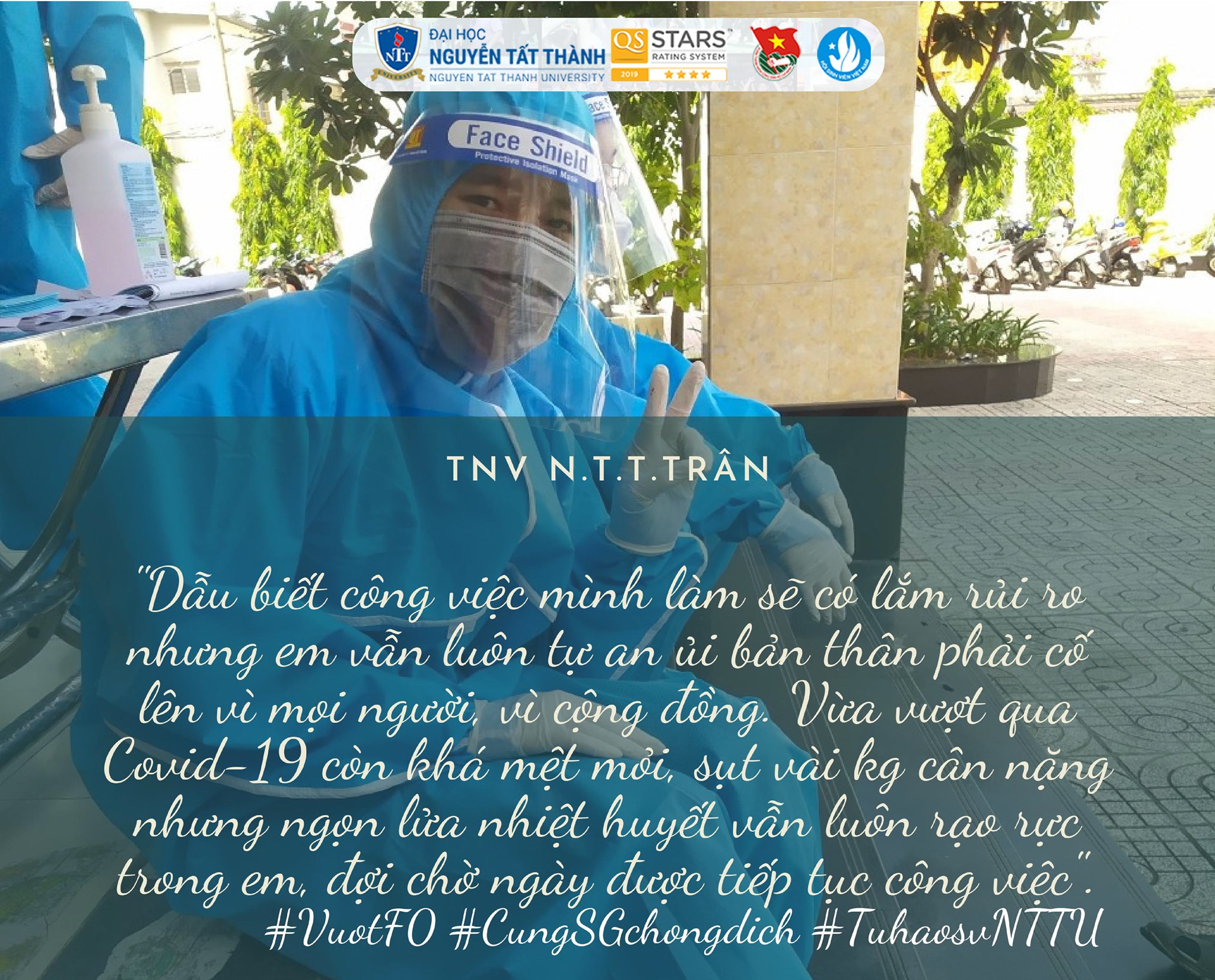 Và không chỉ cô gái ấy, NTTU thật sự chứa đựng quá nhiều sự tự hào. Bạn N.T.T.T – cô gái TNV vượt qua Covid để tiếp tục nhiệm vụ. Trân chia sẻ: “Dù biết công việc mình làm sẽ có lắm rủi ro nhưng em vẫn luôn tự an ủi bản thân phải cố lên vì mọi người, vì cộng đồng. Và điều không mong muốn nhất đã tới, em bị dương tính với Covid-19. Ngay sau khi có kết quả test PCR em được đưa đi điều trị tại một bệnh viên dã chiến ở Q4. Dù đã chuẩn bị trước tinh thần nhưng khi nhận được kết quả em cũng chẳng thể bình tĩnh nỗi, cảm giác vừa sợ vừa lo đã làm em bậc khóc. Khi biết tin, các a/c trong BCH Đoàn – Hội SV Trường, các bạn trong đội hình đã an ủi em rất nhiều, hướng dẫn em từng ly từng tý và thậm chí chuẩn bị tất cả những vật dụng cần thiết cho em trong suốt thời gian điều trị. Giờ nghĩ lại em cảm thấy biết ơn mọi người vô cùng, sự động viên chia sẻ ấy đã giúp em mạnh mẽ hơn rất nhiều. Hiện tại sau khi tình trạng sức khỏe đã ổn định, em xin được quay trở lại đội hình để tiếp tục nhiệm vụ. Tuy không giúp được nhiều nhưng chúng em tin rằng “sự đoàn kết” sẽ tạo nên sức mạnh giúp chúng ta đẩy lùi dịch bệnh”. Cô gái ấy vừa vượt qua Covid-19 còn khá mệt mỏi, sụt vài kg cân nặng nhưng ngọn lửa nhiệt huyết vẫn luôn rạo rực trong em, đợi chờ ngày được tiếp tục công việc.