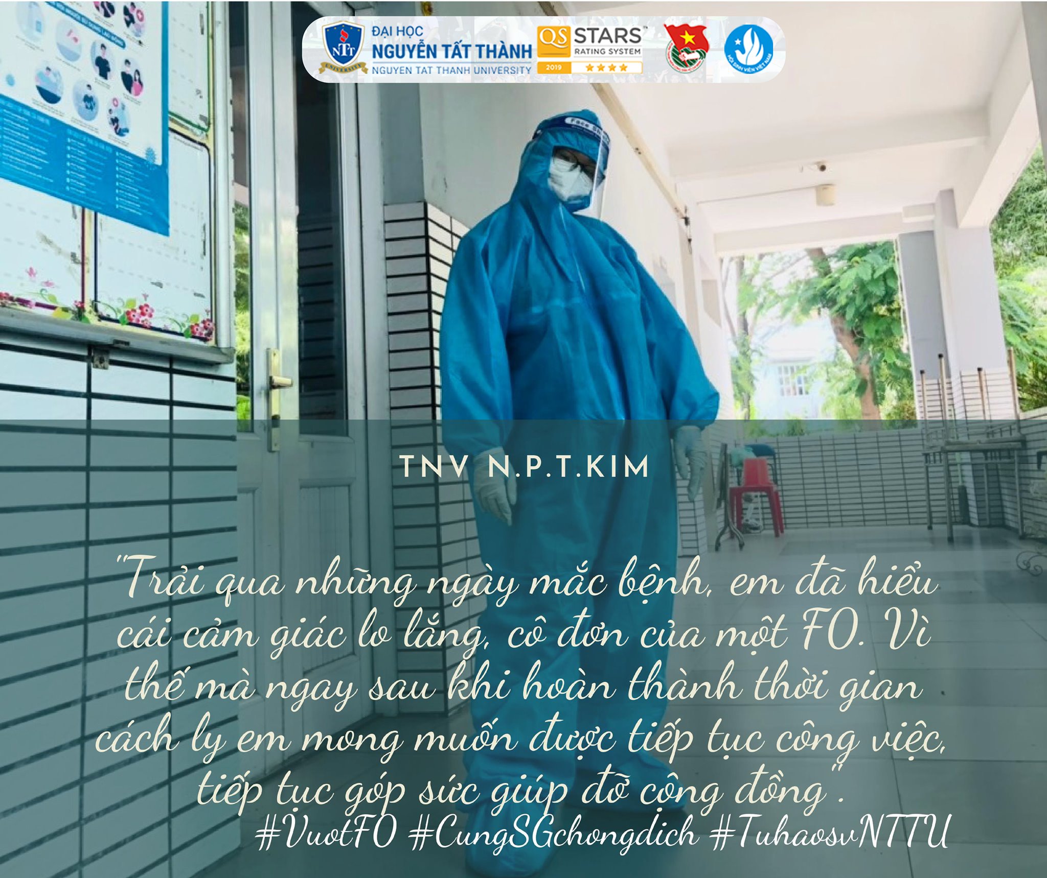 Chị N.P.T.K – một TNV NTTU hiện đang hỗ trợ công tác tiêm vắc xin tại Q.4, vừa trải qua những tháng ngày chiến đấu với dịch bệnh nhưng ngay sau đó Kim đã xung phong mong muốn được tiếp tục hỗ trợ công tác chống dịch. Bản thân là 1 sinh viên khối ngành sức khỏe nên Kim rất mong muốn có thể làm gì đó để cùng cả nước đẩy lùi dịch bệnh. Trải qua nhiều công việc hỗ trợ từ truy vết, test sàn lọc đến hỗ trợ tiêm chủng. Dẫu làm việc từ sáng sớm đến tận đêm khuya trong những bộ đồ bảo hộ cồng kềnh ở những nơi nguy hiểm nhưng chỉ cần nghĩ đến những người mình đã giúp đỡ được em lại thấy rất vui. Đến một ngày Kim cảm thấy cơ thể mệt mỏi bất thường, bắt đầu xuất hiện các triệu chứng và đúng vậy em đã mắc bệnh, khi thấy 2 vạch hiện lên em vô cùng lo sợ và mọi thứ như sụp đổ trước mắt. Đáng buồn hơn là cả gia đình Kim đều dương tính với Sars Cov 2, sự khó khăn lo lắng chồng chất lên đôi vai nhỏ bé của cô con gái lớn trong nhà, nhưng biết làm sao khi em chẳng thể ở cạnh bên gia đình. Ông bà ta thường nói “Một con ngựa đau, cả tàu bỏ cỏ”, từ các anh chị bên Đoàn – Hội SV Trường đến các bạn trong đội hình mỗi người một việc ai ai cũng hỗ trợ em hết mình. Em và gia đình cần gì, thiếu gì dù bận cỡ nào các anh chị cũng chuẩn bị chu đáo, biết Kim không an tâm về gia đình đang điều trị tại nhà nên các anh chị cử hẳn một bạn TNV có chuyên môn thăm hỏi, hướng dẫn điều trị mỗi ngày cho gia đình em. Không những vậy, các anh chị rất quan tâm về sức khỏe của em trong những ngày điều trị, liên tục hỏi thăm, dặn dò em từng chút và còn liên hệ đến cả nhân viên y tế phụ trách để chủ động nắm bắt tình hình. Đối với Kim, nhận được sự quan tâm, hỗ trợ hết mình từ mọi người xung quanh đã tiếp thêm cho em một nguồn sức mạnh rất lớn để vượt qua. Trải qua những ngày mắc bệnh, em đã hiểu cái cảm giác lo lắng, cô đơn của một F0. Cũng chính vì thế mà ngay sau khi hoàn thành thời gian cách ly em mong muốn được tiếp tục công việc, tiếp tục góp sức giúp đỡ cộng đồng.