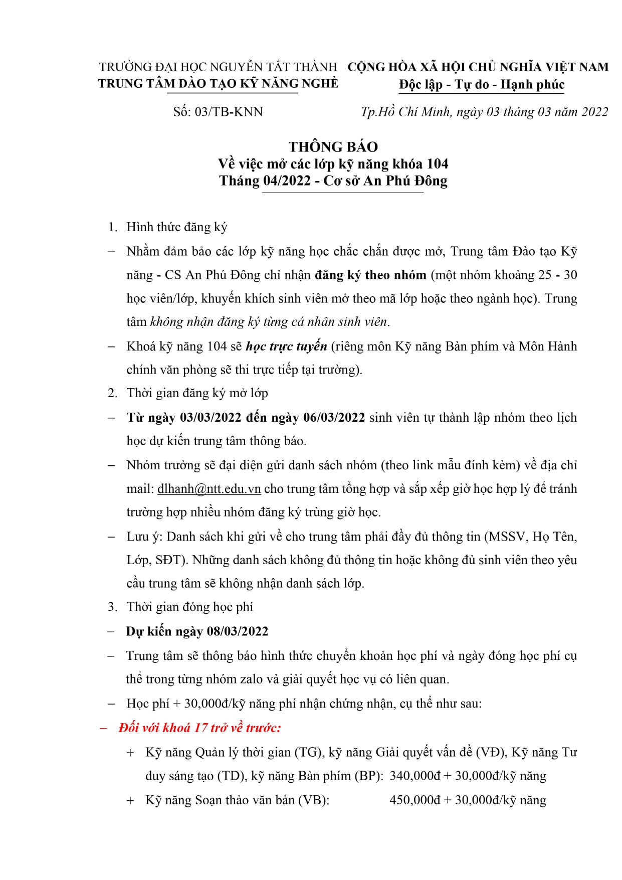 1/ Sinh viên vui lòng kiểm tra các môn kỹ năng cần phải học trong Chuẩn đầu ra trên hệ thống Phòng Đào tạo và chọn kỹ lịch sau đó mới điền thông tin vào link đăng ký, tránh trùng lịch học với các môn học chính quy hoặc các môn kỹ năng khác.