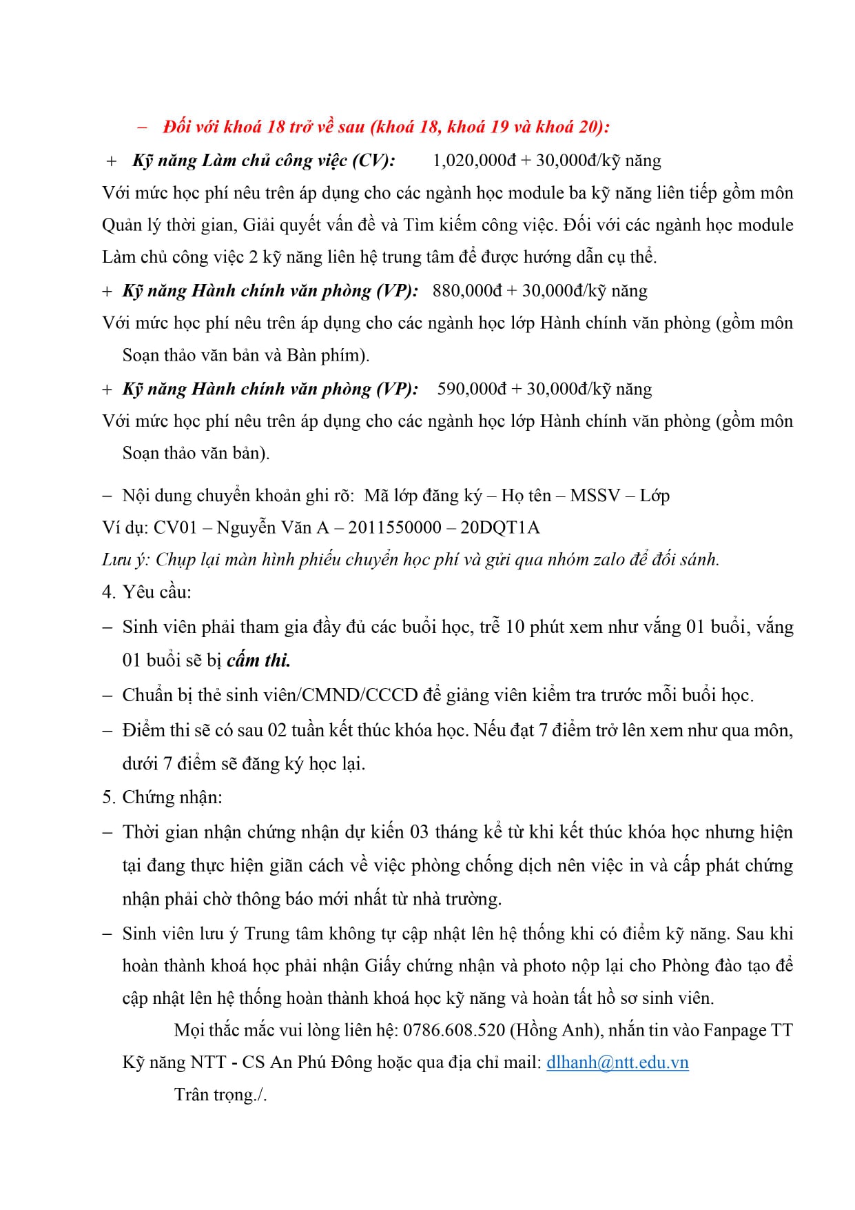 6/ Sinh viên lưu ý Trung tâm không tự cập nhật lên hệ thống khi có điểm kỹ năng. Sau khi hoàn thành khoá học phải nhận Giấy chứng nhận và photo nộp lại cho Phòng đào tạo để cập nhật lên hệ thống hoàn thành khoá học kỹ năng và hoàn tất hồ sơ sinh viên.