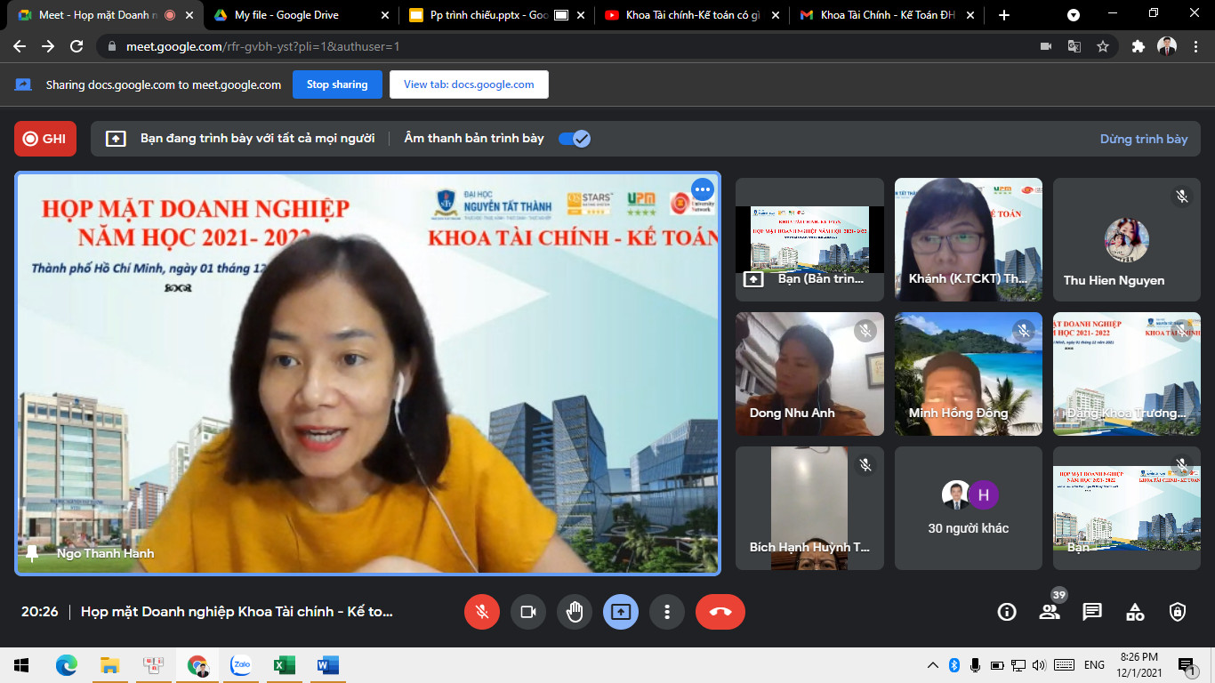 Ngày 01/12/2021, Khoa Tài chính – Kế toán đã tổ chức thành công chương trình Họp mặt Doanh nghiệp năm học 2021–2022 theo hình thức trực tuyến, thu hút hơn 40 đại diện doanh nghiệp đa lĩnh vực cùng tham gia