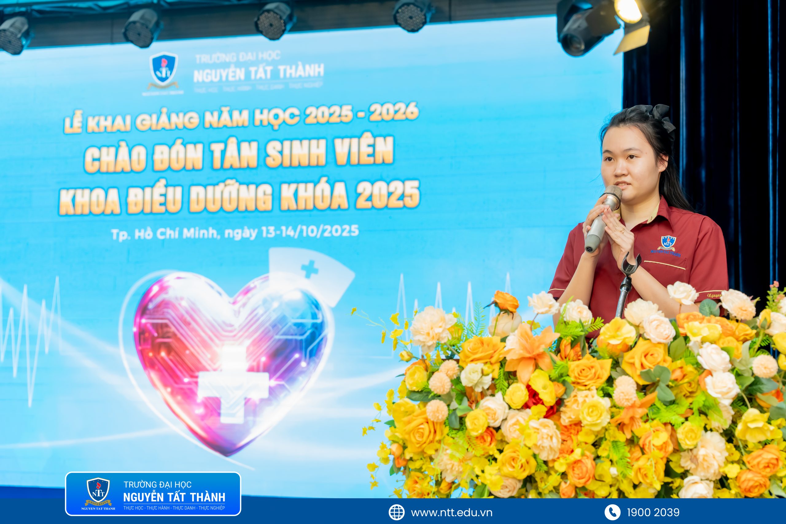 Đại diện cho các tân sinh viên ngành Điều dưỡng, thủ khoa Nguyễn Thanh Vy đã gửi lời tri ân đến Quý thầy cô cũng như những lời chào mừng đến các tân sinh viên của khoa. Vy chia sẻ, khi biết mình được trở thành sinh viên Điều dưỡng, bản thân vừa hạnh phúc, vừa cảm thấy một trọng trách lớn lao đặt trên vai – trách nhiệm không chỉ với bản thân, mà còn với gia đình, nhà trường và xã hội. Việc chọn học dưới mái Trường ĐH Nguyễn Tất Thành sẽ cho các tân sinh viên đầy đủ nền tảng kiến thức, kỹ năng và đạo đức nghề nghiệp để trở thành những điều dưỡng viên tận tâm, chuyên nghiệp và nhân ái.