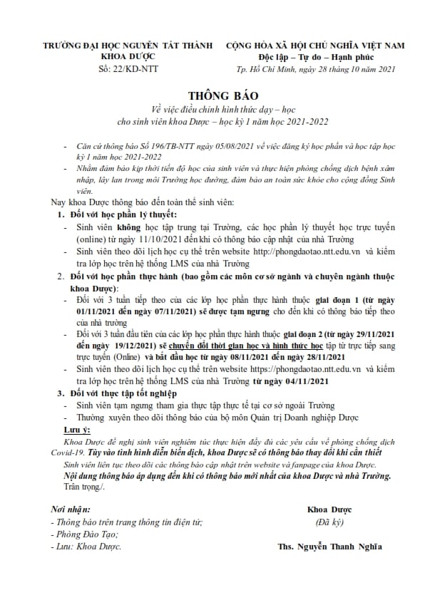 Trang chủ / Thông tin - thông báo / Khoa Dược thông báo về việc thay đổi hình thức giảng dạy và thời gian học các lớp trong HK1 năm học 2021-2022 ntlam / 8:59 am 01/11/2021 Thông tin - thông báo Khoa Dược thông báo về việc thay đổi hình thức giảng dạy và thời gian học các lớp trong HK1 năm học 2021-2022 Post Views: 1,102 Tin liên quan Tin tức - Sự kiệnTin tức - Sự kiệnTin tức - Sự kiện Vĩnh biệt PGS.TS. Nguyễn Mạnh Hùng – Vị thuyền trưởng tài ba của “con tàu tri thức” mang tên Trường ĐH Nguyễn Tất Thành 23/11/2025 Thông tin - thông báo Thông tin - thông báo Thông tin - thông báo Thông tin - thông báo Thông tin - thông báo Người tốt và việc tốtTin tức - Sự kiện “NGƯỜI TỐT, VIỆC TỐT” NÉT ĐẸP VĂN HÓA TRUNG THỰC TẠI ĐẠI HỌC NGUYỄN TẤT THÀNH 11/11/2025 Thông báo Về việc nộp hồ sơ nhập học và nhận quà Tân sinh viên Khóa 2025 30/10/2025 Thông báo Về việc nghỉ Tết Dương lịch và Tết Nguyên đán Bính Ngọ năm 2026 29/10/2025 Nhắc nhở hằng ngày NHẮC NHỞ: GIỮ TÁC PHONG HỌC TẬP NGHIÊM TÚC – TUÂN THỦ NỘI QUY 23/10/2025 Thư gửi cán bộ giảng viên, sinh viên Trường ĐH Nguyễn Tất Thành THÔNG BÁO về việc nhắc nhở sinh viên NTTU chấp hành nghiêm chủ trương chính sách của Đảng, pháp luật Nhà nước và quy chế, quy định của Nhà trường
