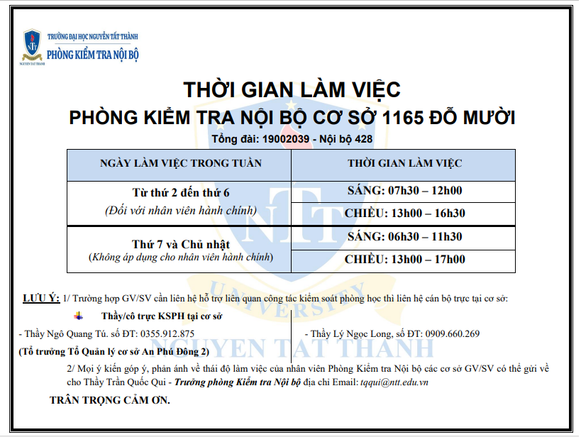 - Nhấn 428 để liên hệ với Phòng Kiểm tra Nội bộ cơ sở 1165 Đỗ Mười, Phường An Phú Đông, TP. HCM