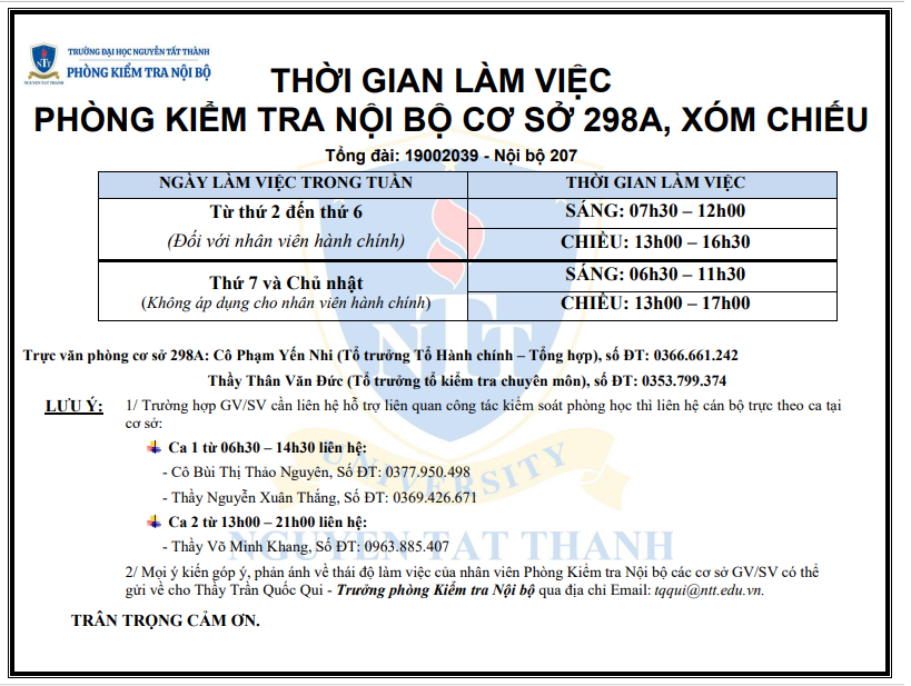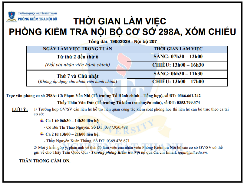 - Nhấn 207 để liên hệ với Phòng Kiểm tra Nội bộ cơ sở 298A Nguyễn Tất Thành, Phường Xóm Chiếu, TP. HCM