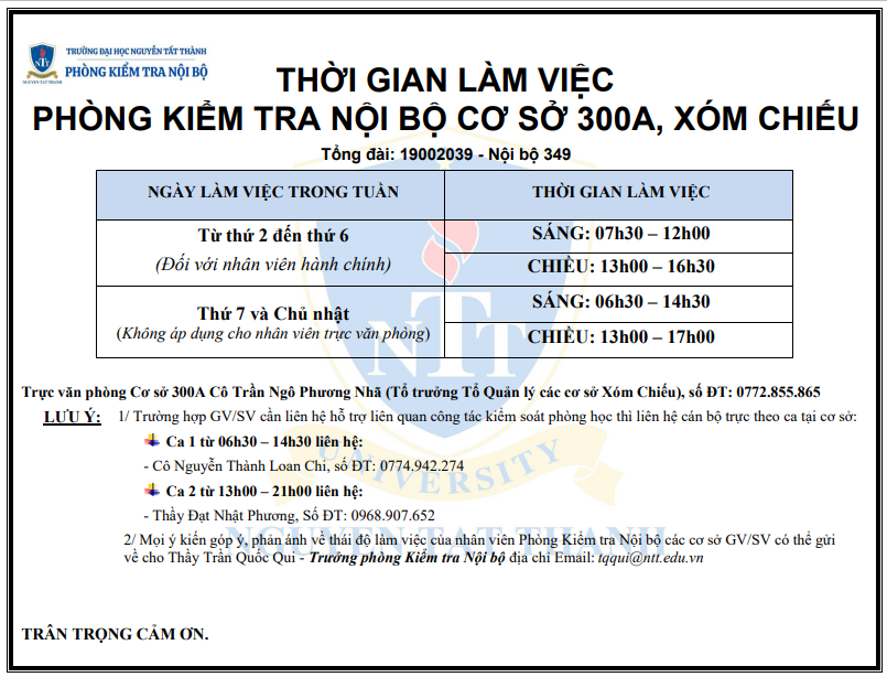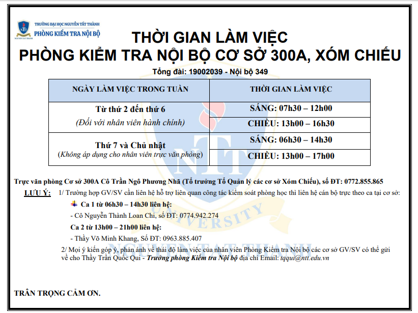 - Nhấn 349 để liên hệ với Phòng Kiểm tra Nội bộ cơ sở 300A Nguyễn Tất Thành, Phường Xóm Chiếu, TP. HCM
