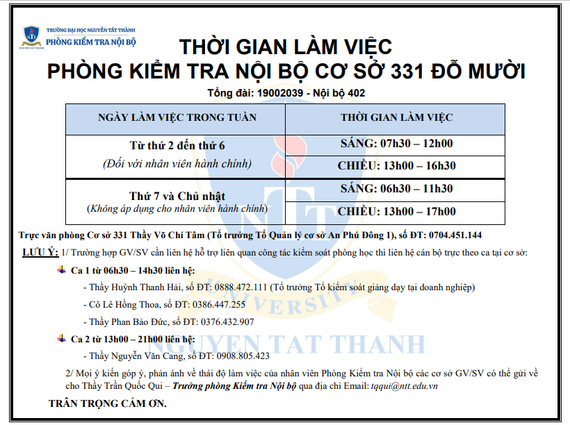 - Nhấn 402 để liên hệ với Phòng Kiểm tra Nội bộ cơ sở 331 Đỗ Mười, Phường An Phú Đông, TP. HCM