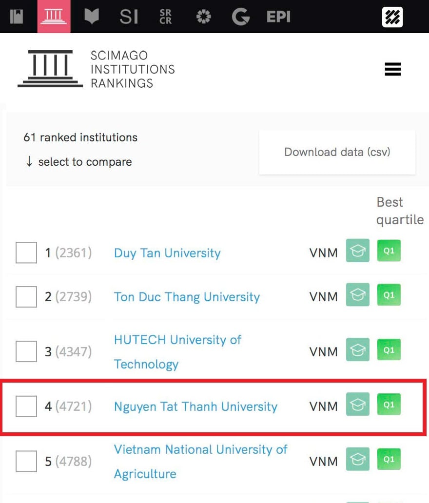 Năm 2026, tại Việt Nam, có 61 cơ sở giáo dục đại học được SCImago xếp hạng, tăng 15 trường so với năm trước. Dù ghi nhận sự gia tăng lớn về số lượng các cơ sở giáo dục đại học được xếp hạng, thế nhưng Trường ĐH Nguyễn Tất Thành xuất sắc góp mặt trong TOP 5 trường đại học dẫn đầu.